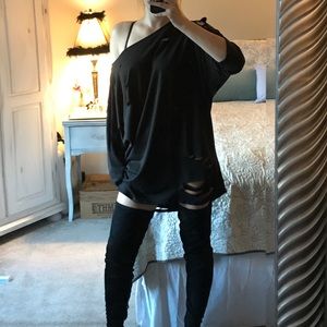 Black Distressed French Terry Sweater Dress. So comfortable and chic. I've worn the gray one and I absolutely love it. Dress it up, dress it down.. you'll look good either way!! Made in the USA 🇺🇸. 87% Polyester 10% Rayon 3% Spandex. Breathable, good quality, looks great paired with leggings/fishnets or a pair of badass boots.
