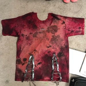 Distressed by me from old tee shirt. Bleached and dyed. Zippers with lacing detail sewn in the bottom