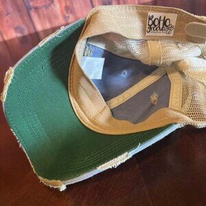 Hat features intentional distressing and frayed patches.