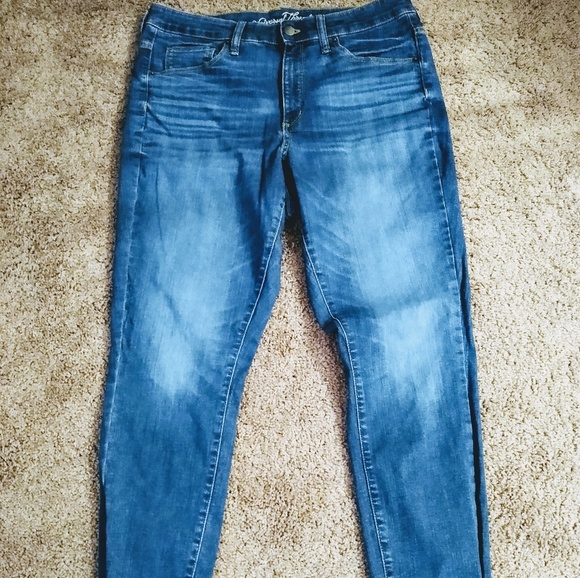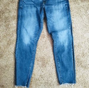 Blue jeans with a distressed ankle-length hem. Only worn a few times. No signs of wear between the legs either!