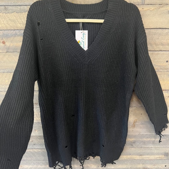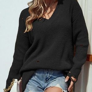 Distressed V-Neck Rib-Knit Sweater