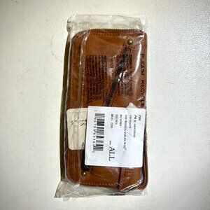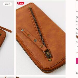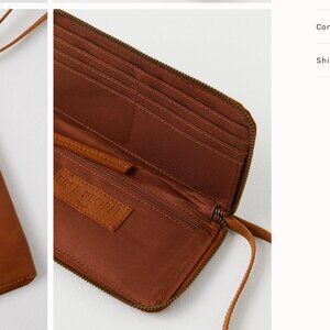 Features: Vegan leather fabrication, worn finish, interior zipper pocket, cash pocket, 6 card slots, zipper closure, attached wrist strap