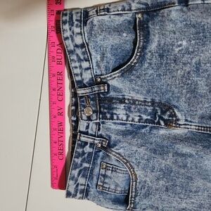 Trendy distressed jeans. Acid wash design. Comfortable fit.Distressed womens jeans light Wash size XS rips holes distressed distroyed pre owned good condition see pics see pics for measurements