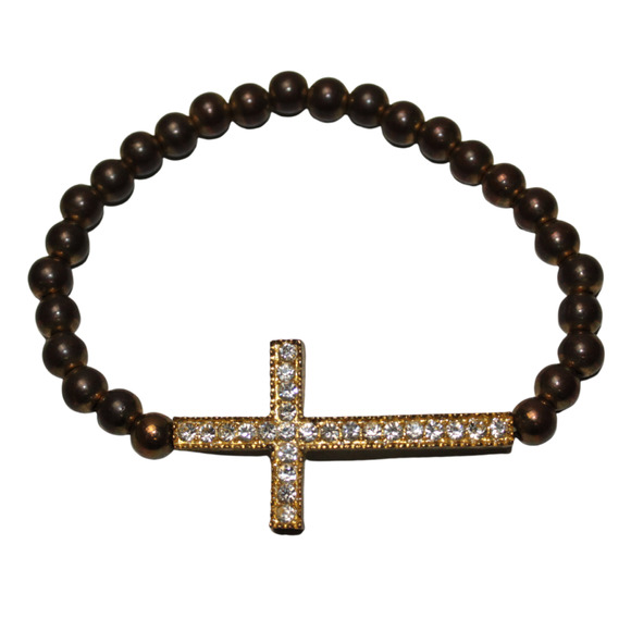 Distressed Worn Gold Tone Copper Cross Rhinestone Charm Beaded Stretch Bracelet