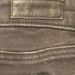 AG zip-up skinny ankle length jeans with stretch. Note the waistband is low rise/ mid rise for those who prefer a lower rise. Distressed black, no holes; zips at ankles are great for accommodating different boots. I'm 5'4 and these are the perfect jean length for me with short booties - basically hit the lower ankle bone with no break at the ankle. If you are taller, they will be cropped (28" inseam). Note that I am selling a bunch of AG - happy to discount purchase of multiple pairs.