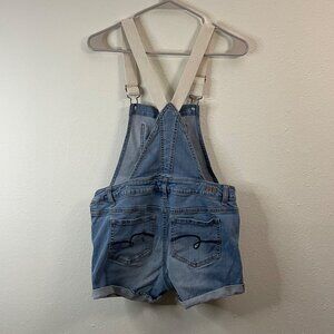Distressed blue denim short jumpsuit with adjustable white straps, Size 16