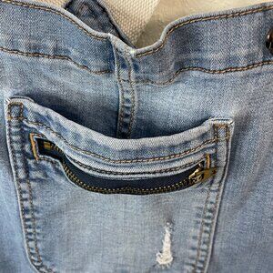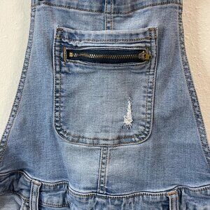 Denim Blue Distressed Short Overalls With Adjustable White Straps Front Zipper Pocket & Rolled Hem