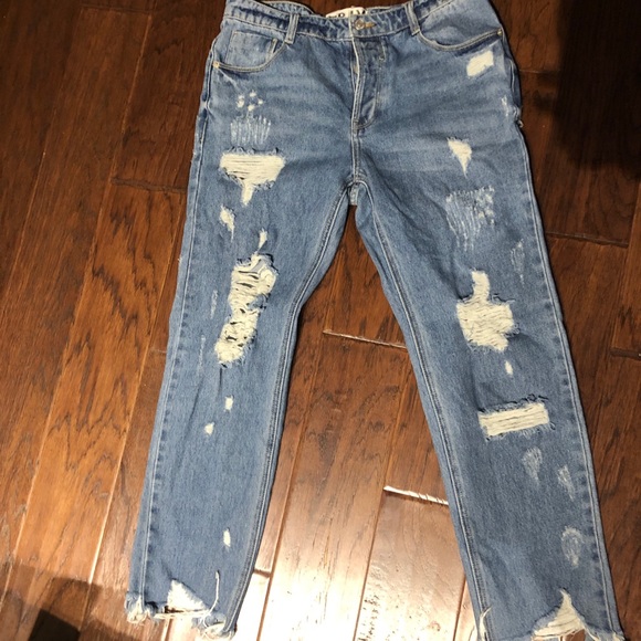 My favorite pair of distressed boyfriend jeans from a local upscale boutique. Great quality. Tag says size medium, but fit more like a small. Only worn twice!!
