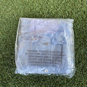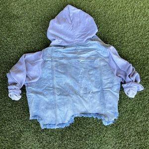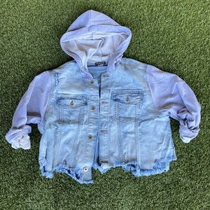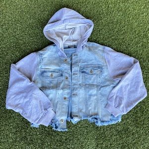 Lightweight sweatshirt and denim material cropped jacket. Has hoodie and buttons in the front. Two tone and trendy. Size medium but RUNS OVERSIZE. Would fit L or XL best. NEVER WORN!