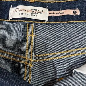 Super cute in the latest summer style. High waist, short shorts with rhinestones around the front pockets. Dark blue color. Brand is Denim Blvd by Iris Basic.