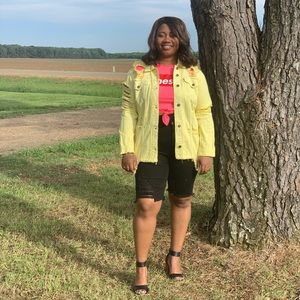 Color is yellow. Jacket is distressed in the front and back. Has button as fastener. BNWT