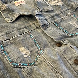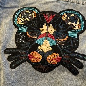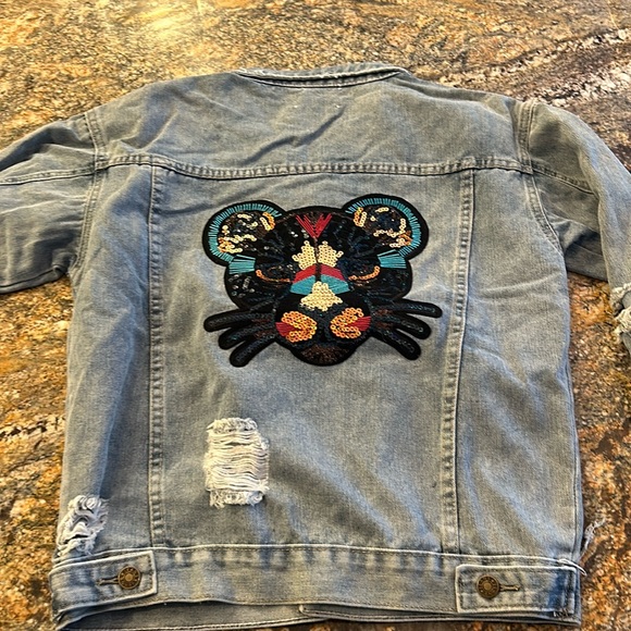 Distressed denim jacket with crystals on front pockets and cat appliqué with sequins