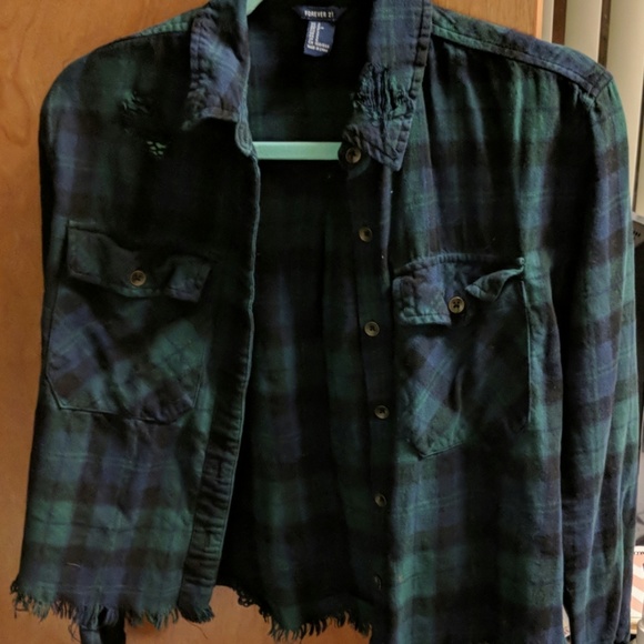 Dark green and blue flannel with fringed bottom and distressed sections throughout