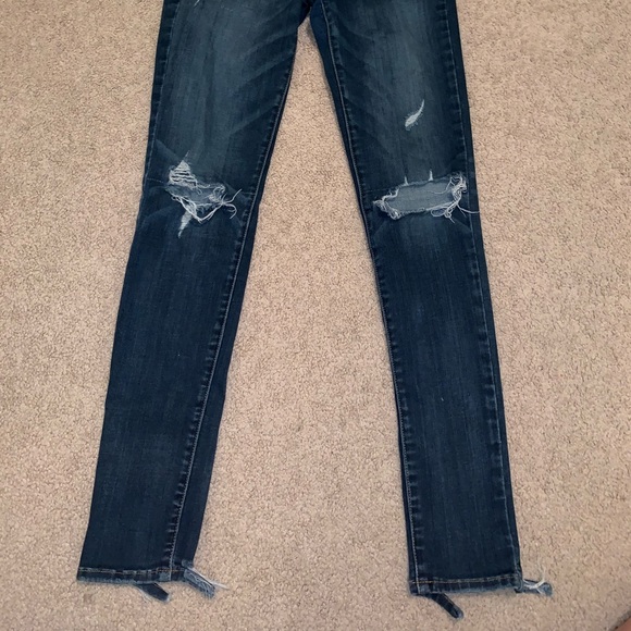 American eagle jeans with rips in the knees and around bottom. Size 4 but fit me and i’m usually a size 2.