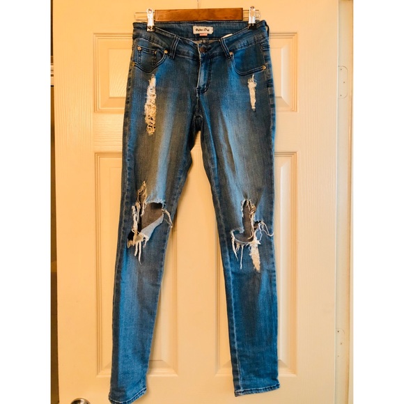 Distressed jeans with fleur di lis embellishment on the pockets. Very form fitting which make your butt look great always! Gently used. Not actually from Buckle, just trying to get them noticed. Smoke free home.