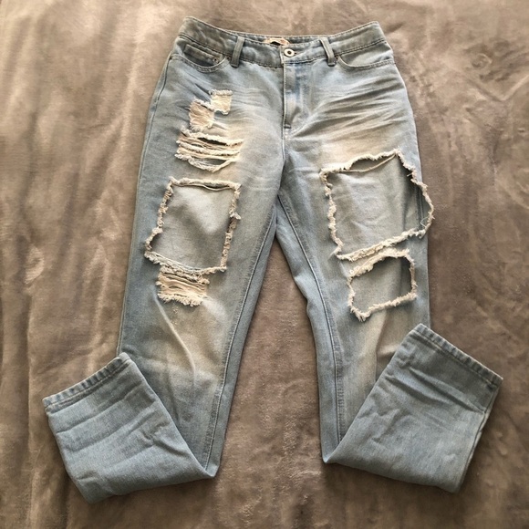 Distress mid to high rise jeans/ size 3 in great condition/ rise is 11” / waist is 14” across / inseam is 28”/ ankles and be folded up, they were folded down for measurements and try on/ non stretchy denim the perfect light wash