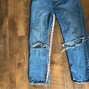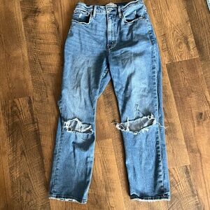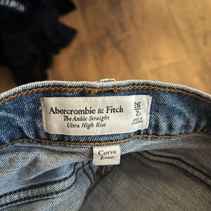 Abercrombie and fitch high rise jeans Straight leg. Part of the curve love line. Great for petite folks. Distressing on knees. No flaws.