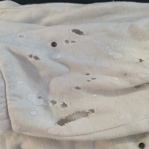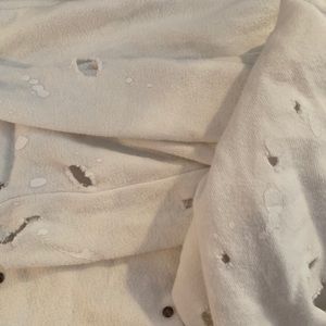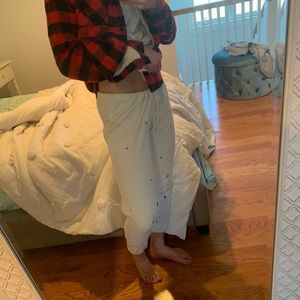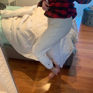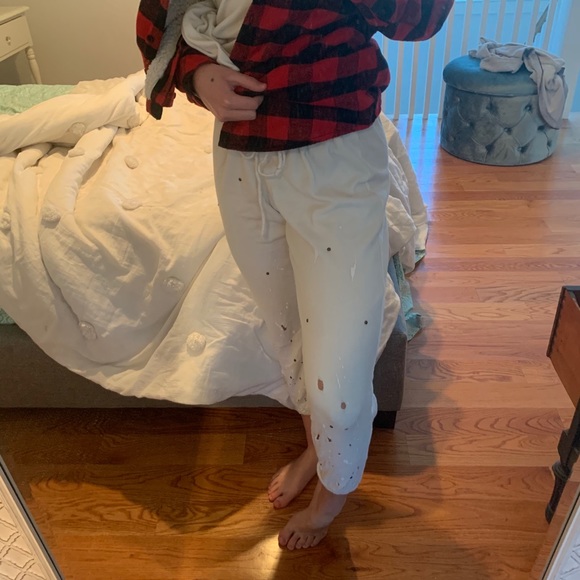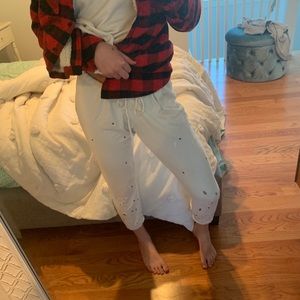 Distressed white joggers with paint splatters, rips and gems. Waistband looks wide when your receive it but you just have to tighten it!