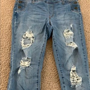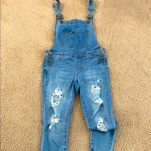 Juniors size xL distressed overalls. Skinny style crop jeans with frayed bottom