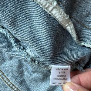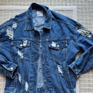 Elevate your style with this chic blue distressed jean jacket. Perfect for casual outings, this jacket adds a trendy touch to any outfit.