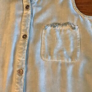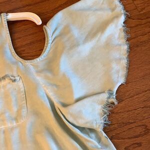 Distressed Denim-look Umgee medium cold shoulder top with long split back. Like new condition