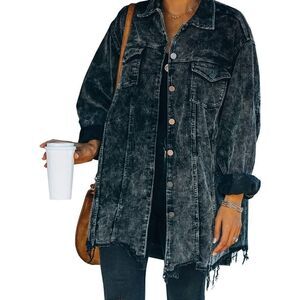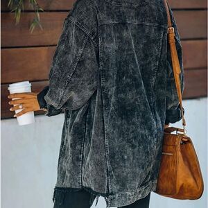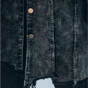 Oversized button down corduroy shirt jacket. Frayed hem with a distressed look.