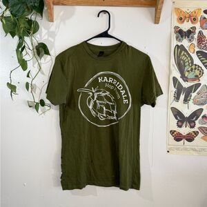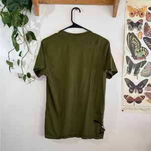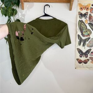 Short sleeve green karridale hop farm distressed t shirt has holes