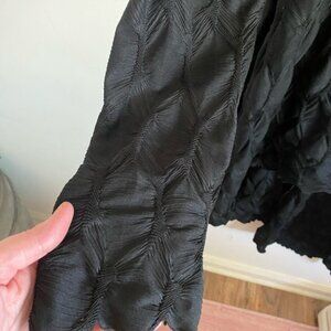 Great black dress with textured pattern. Long sleeves for a stylish look. Bottom hem is both hi-low, but sort of asymmetrical also.