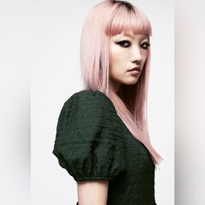 - Structured square neckline contrasts from short puff sleeves