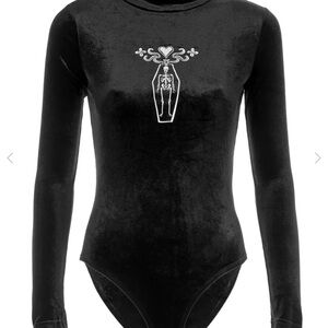 Long sleeves for a sleek look. One NWT Black velvet bodysuit. Witchy angled sleeves, Close-fit & smoothing with a comfy stretch,Two-popper closure on inner crotch, Velvety-soft material like a dreamy second skin, High neck & long sleeves for layering looks, Skeleton chest embroidery in white. UK size 12 is a U.S. size 10/L