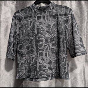 New without tags. Snake print short-sleeved mesh crop top. Close, cropped fit & classic crew neckline to maximize layering potential. Comfortable short sleeves. Stretchy sheer mesh fabrication. All-over serpentine print in a contrasting soft grey. 95% polyester, 5% elastane.