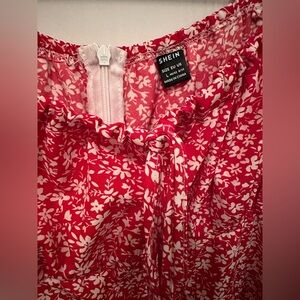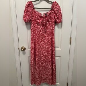 Very cottage core dress. It features a striking red and white color palette with a square neckline and cap puff sleeves. The midi-length dress has a stylish side slit, offering both elegance and comfort.