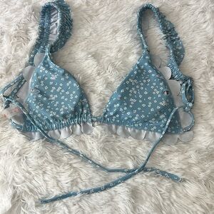 Ditsy Floral Ruffled String Bikini Top Light Blue w White Daisys Adjust