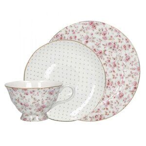 This lovely discontinued design in fine bone china tea set features the ditsy floral pattern on a beautiful white teacup with a cute polka dot saucer and floral cake plate with metallic gold details. Perfect for Spring and Easter.