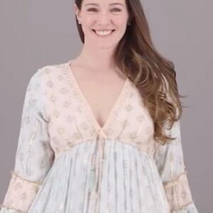 NEW! Beautiful Bohemian Style Prairie Maxi Dress in layers of baby blue and peach! V Neck with tie front. 3/4 length sleeves Elastic midriff. This would be a perfect beach dress or for a cruise or resort vacation! It is simply stunning. Made of 100% Rayon fabric. Made in India Available in Women's S/M 4/6/8 or M/L 10/12/14
