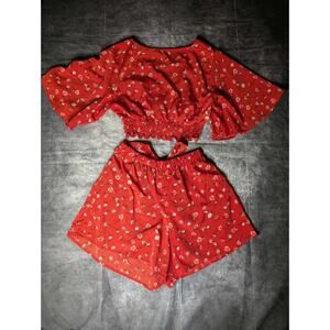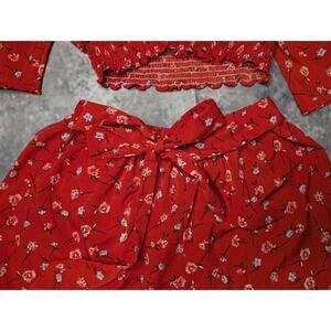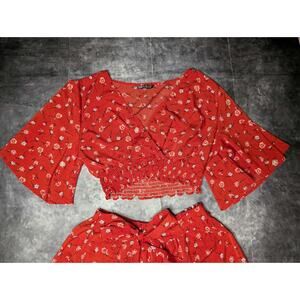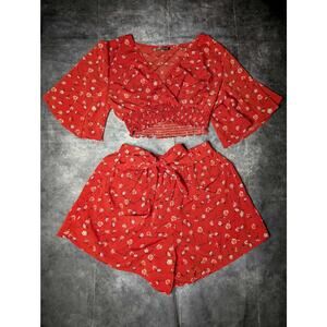 Ditsy Red Floral Surplice Front Shirred Top & Belted Shorts Spring Summer Size M