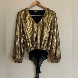 Diva Attitude Gold Pleated Long Sleeve Bodysuit NWOT