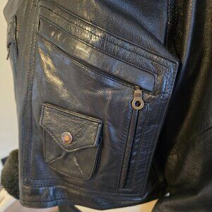 Chic black leather cropped jacket with sherpa collar and cuffs, lots of pockets, adjustable snap waist tabs, front zipper closure and fully lined by Diva Sport NYC