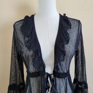 Styles: sheer robe lingerie robe boudoir robe romantic robe delicate lace trim ruffle trim sheer cover-up nightwear loungewear bridal robe honeymoon lingerie elegant sleepwear boudoir photoshoot vintage inspired victorian style gothic aesthetic dark academia boudoir fashion ethereal style feminine elegant luxurious timeless classic statement piece special occasion evening wear delicate fabric textured fabric sheer overlay sheer sleeves flowy silhouette boudoir vibes.