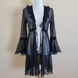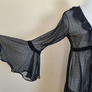 Robe-esque cover in a sheer black mesh with dots.