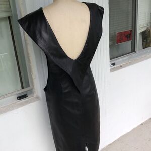 Very cool vintage leather dress. Measuring across the top seam to seam is approximately 15 inches, pit to pit is 16 , across the pockets is 17, length is 40, v in the back is 15. Great vintage dress