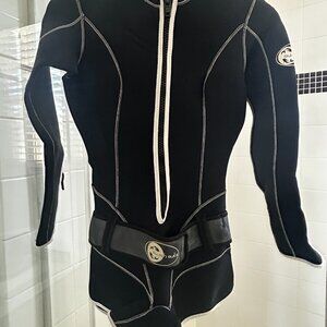 Women's Swish Suits 3mm in large (VERY Bond Girl style), never been in the water . Eco-neoprene, good for surfing or scuba diving/free-diving. One full-front zipper up the front and thick buckle/belt in the front.