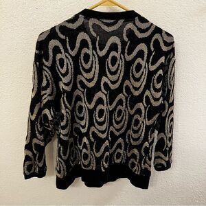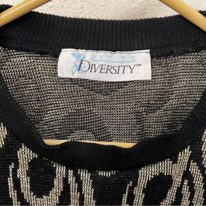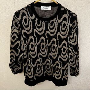 This fun sweater is from Diversity. This item is black with a gold pattern. It has a crew neck. The size is petite. The measurements are 21” L x 20”!W (pit to pit) x 16” sleeve (shoulder to cuff). This sweater will be a great addition for a night out. It has been gently worn but is in very good condition.