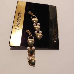 NWT women's pierced costume earrings , these were mine and I believe I bought them in the 80s. They are for pierced ears on a stud, over 1.5" long, gold tone with faux pearls. Never worn
