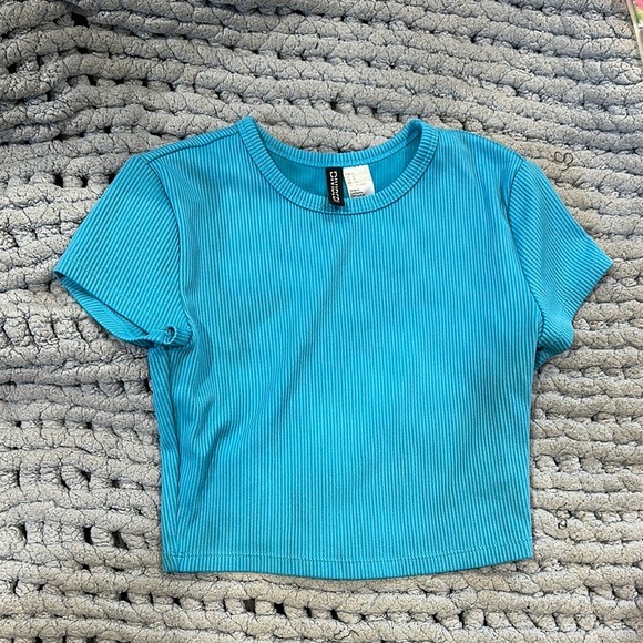 Stylish ribbed crop top. Vibrant blue color. Short sleeves. Perfect for casual wear.