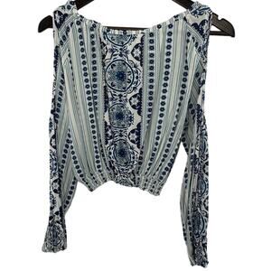 Divided By H&M Cold Shoulder Crop Blouse Size 6 Blue White Bohemian Hippie Y2K