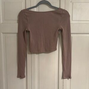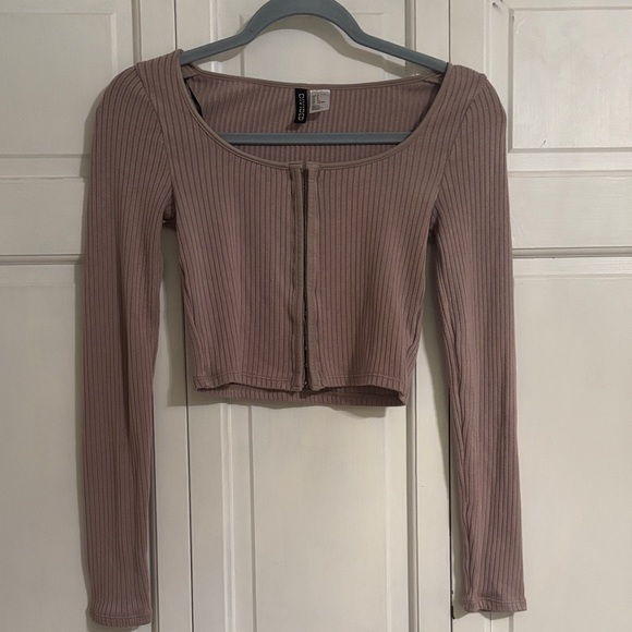 Trendy ribbed crop top with long sleeves. Features a front zipper. Ideal for layering or wearing alone.