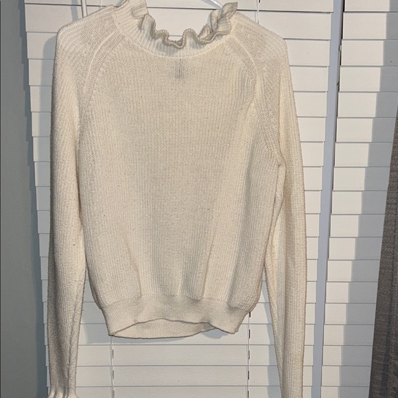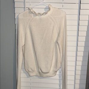Chic cream sweater with a ruffle neck. Perfect for layering.