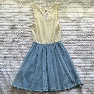 Elegant casual dress with a cream top and blue skirt. Perfect for everyday wear.