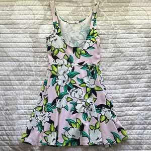 Sleeveless dress with vibrant floral print. Features pink base with green and white flowers. Perfect for casual outings.